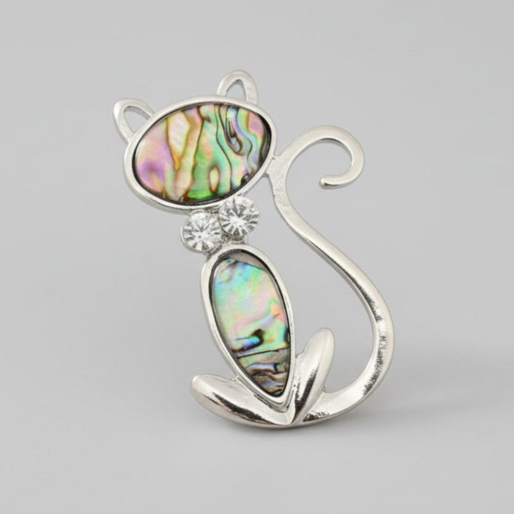 Perch this whimsical Tom cat brooch on your lapel or collar for an instant touch of vintage charm. Crafted in silver-tone metal, the seated feline features a luminous abalone shell body and head that shifts with iridescent blues, greens, and purples. Delicate rhinestone accents catch the light, adding sparkle and sophistication to this playful piece. Perfect for cat lovers and collectors of quirky, statement jewelry.